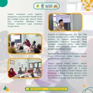 Kegiatan ini diselenggarakan oleh Biro SDM UNUSIDA, cakupan materi pada Induksi tahap pertama ini meliputi gambaran umum pelaksanaan tridarma perguruan tinggi sekaligus pelaporan beban kerja dosen, dibahas pula mengenai jabatan akademik, pangkat dan golongan dosen.