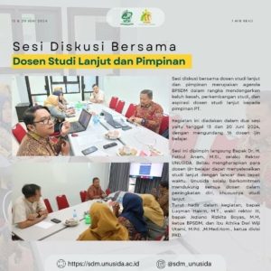 Sesi ini dipimpin langsung Bapak Dr. H. Fatkul Anam, M.Si., selaku Rektor UNUSIDA. Beliau mengharapkan para dosen ijin belajar dapat menyelesaikan studi lanjut dengan lancar dan tepat waktu. UNUSIDA selalu berkomitmen mendukung semua dosen dalam peningkatan diri, khususnya studi lanjut.