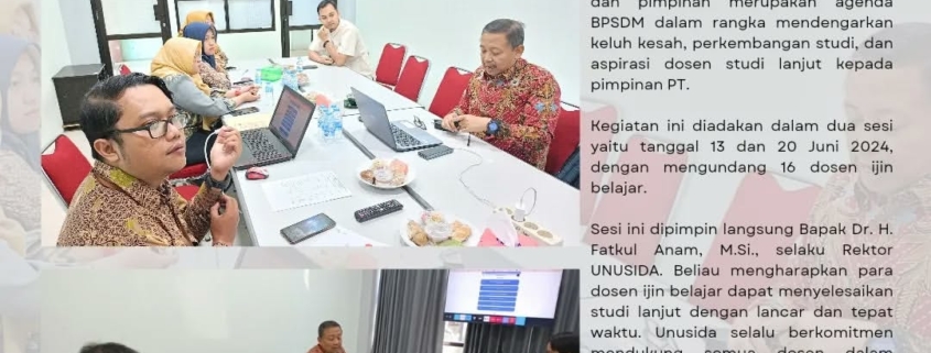 Sesi ini dipimpin langsung Bapak Dr. H. Fatkul Anam, M.Si., selaku Rektor UNUSIDA. Beliau mengharapkan para dosen ijin belajar dapat menyelesaikan studi lanjut dengan lancar dan tepat waktu. UNUSIDA selalu berkomitmen mendukung semua dosen dalam peningkatan diri, khususnya studi lanjut.