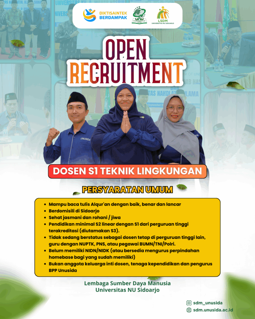Universitas Nahdlatul Ulama Sidoarjo membuka kesempatan bagi putra-putri terbaik bangsa untuk bergabung sebagai Dosen Tetap Program Studi S1 Teknik Lingkungan di bawah Fakultas Teknik.