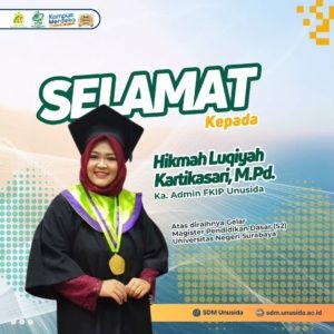 SELAMAT KEPADA HIKMAH LUQIYAH KARTIKASARI, M.PD. KA. ADMIN FKIP UNUSIDA ATAS DIRAIHNYA GELAR MAGISTER PENDIDIKAN DASAR (S2)