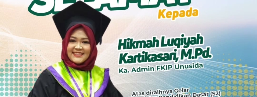 SELAMAT KEPADA HIKMAH LUQIYAH KARTIKASARI, M.PD. KA. ADMIN FKIP UNUSIDA ATAS DIRAIHNYA GELAR MAGISTER PENDIDIKAN DASAR (S2)
